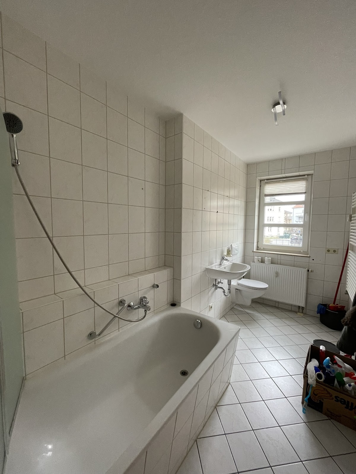 helles Tageslichtbad mit Wanne und Waschmaschinenanschluss